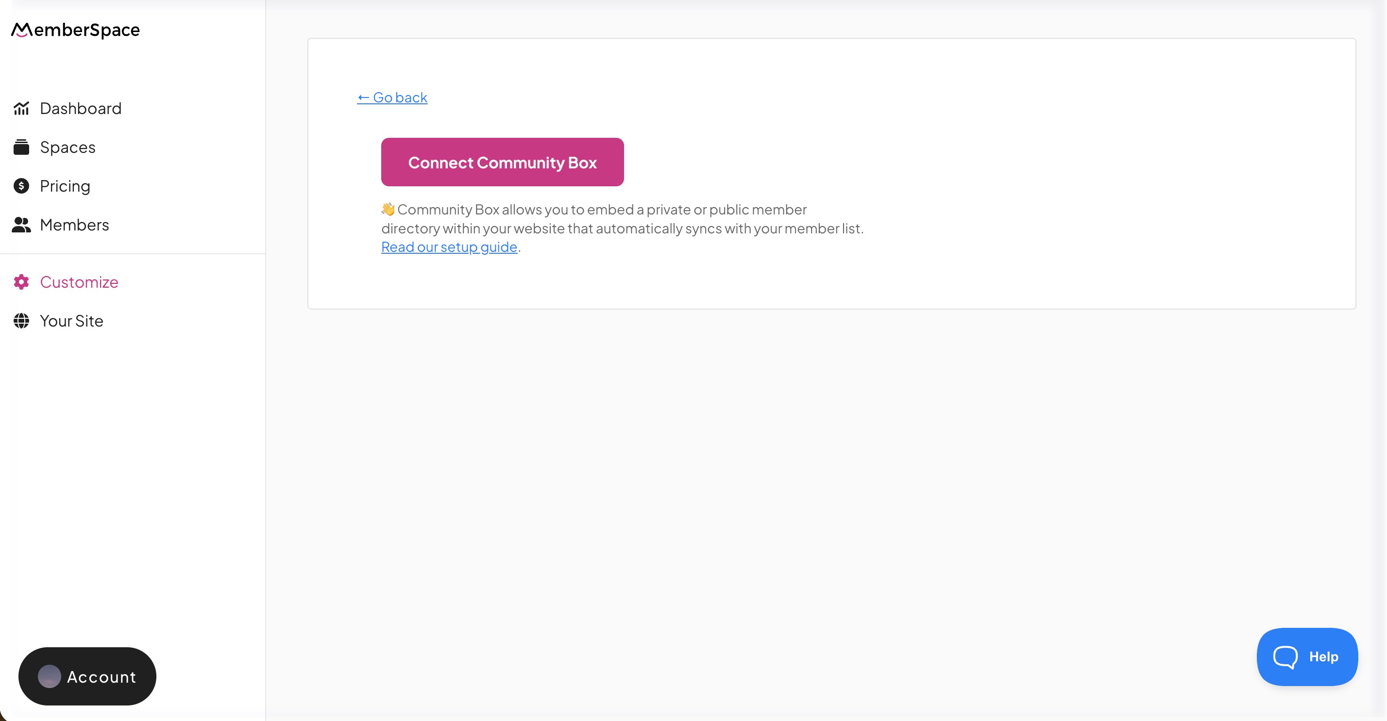 Log into your MemberSpace account > click on Customize > Integrations > Community Box > then click Connect Community Box: