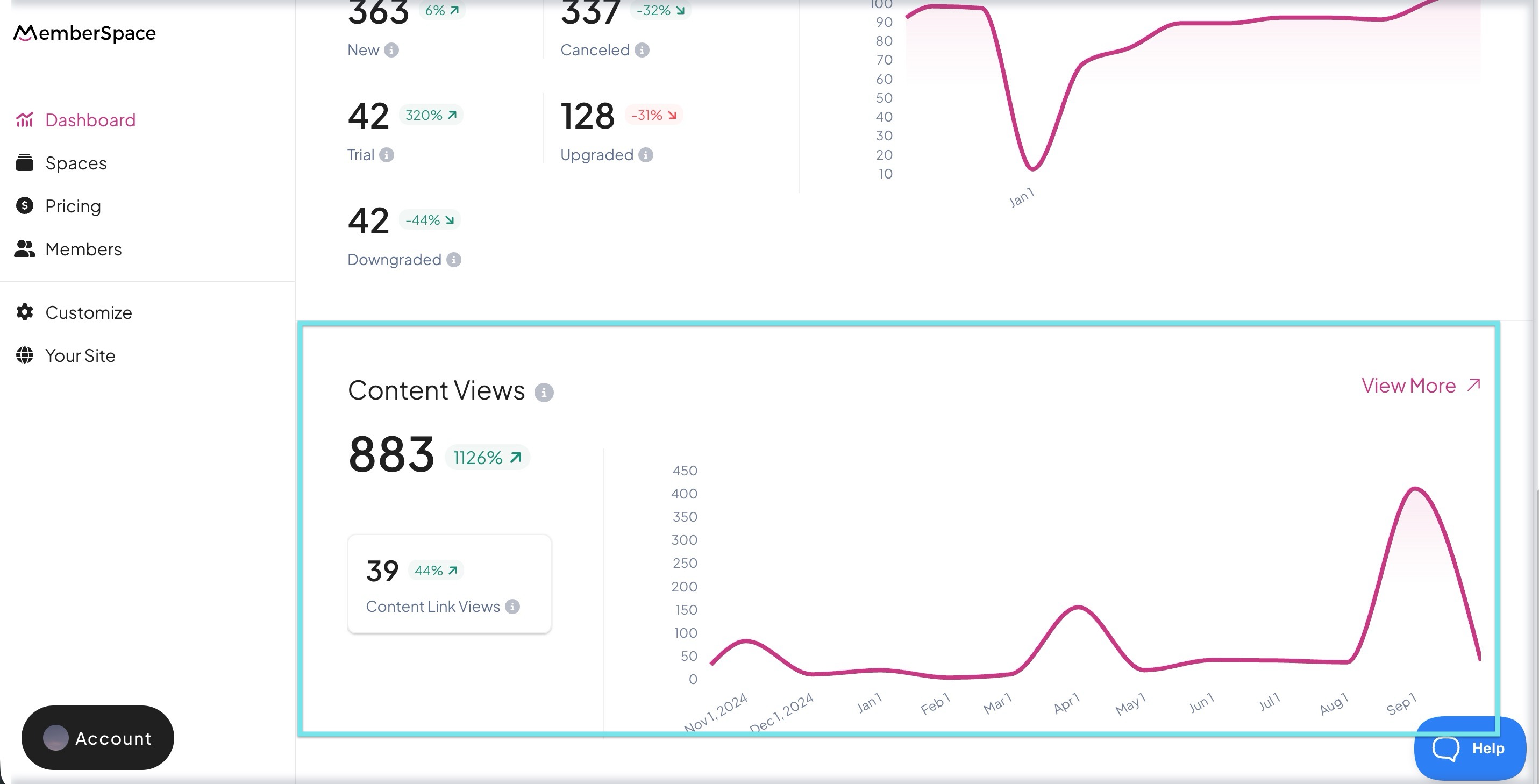 In your MemberSpace Dashboard, you will find analytics for Content. To access more details about Content Views, click View More above the graph