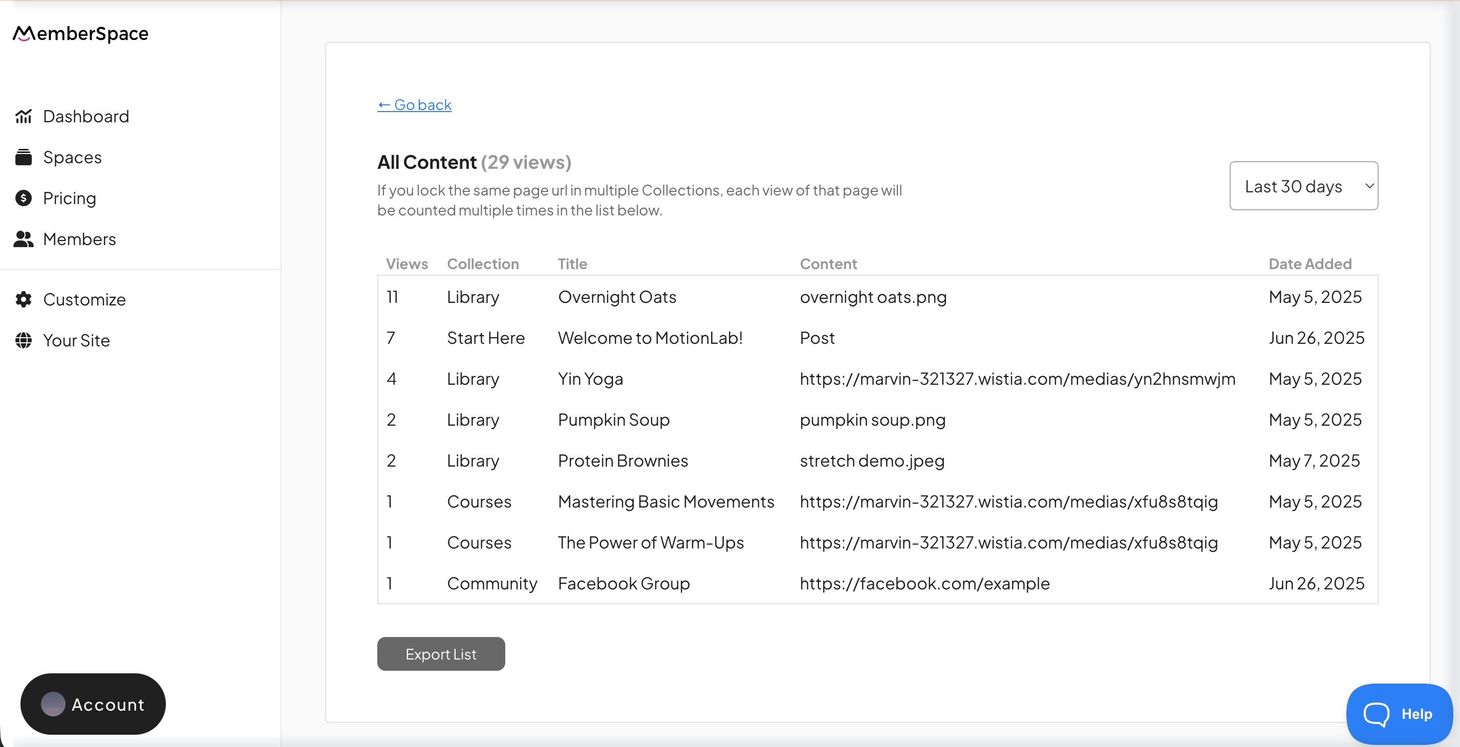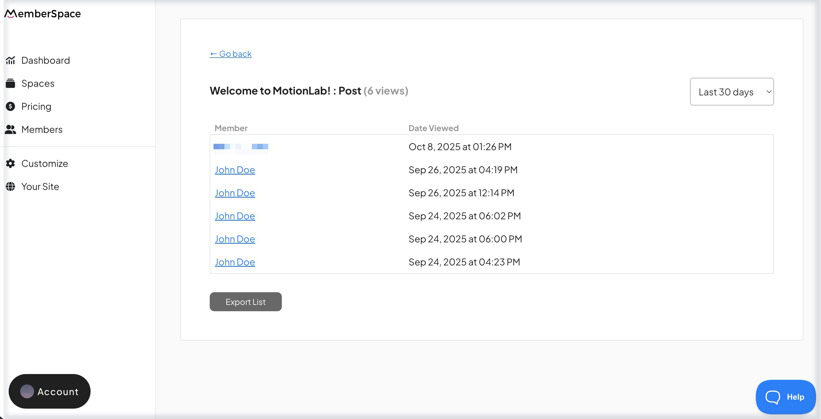 With MemberSpace, you have access to detailed analytics on how your members interact with your content. To get a quick snapshot of your overall engagement, you can easily view what content your members visited and when.