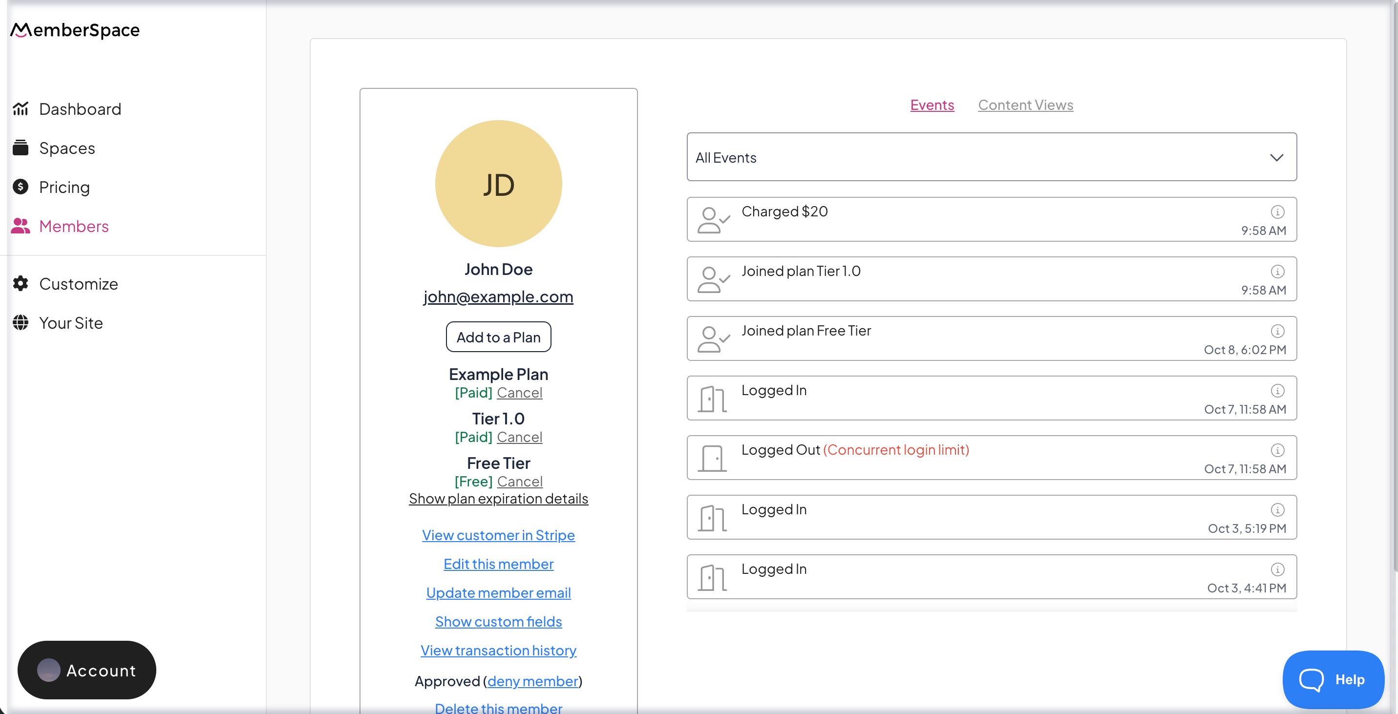 As an admin, you can view all the details about each member individually in your MemberSpace backend under Members > View member details. This includes basic info such as their name and email as well as dates and times for Events such as logins/logouts and Content Views.