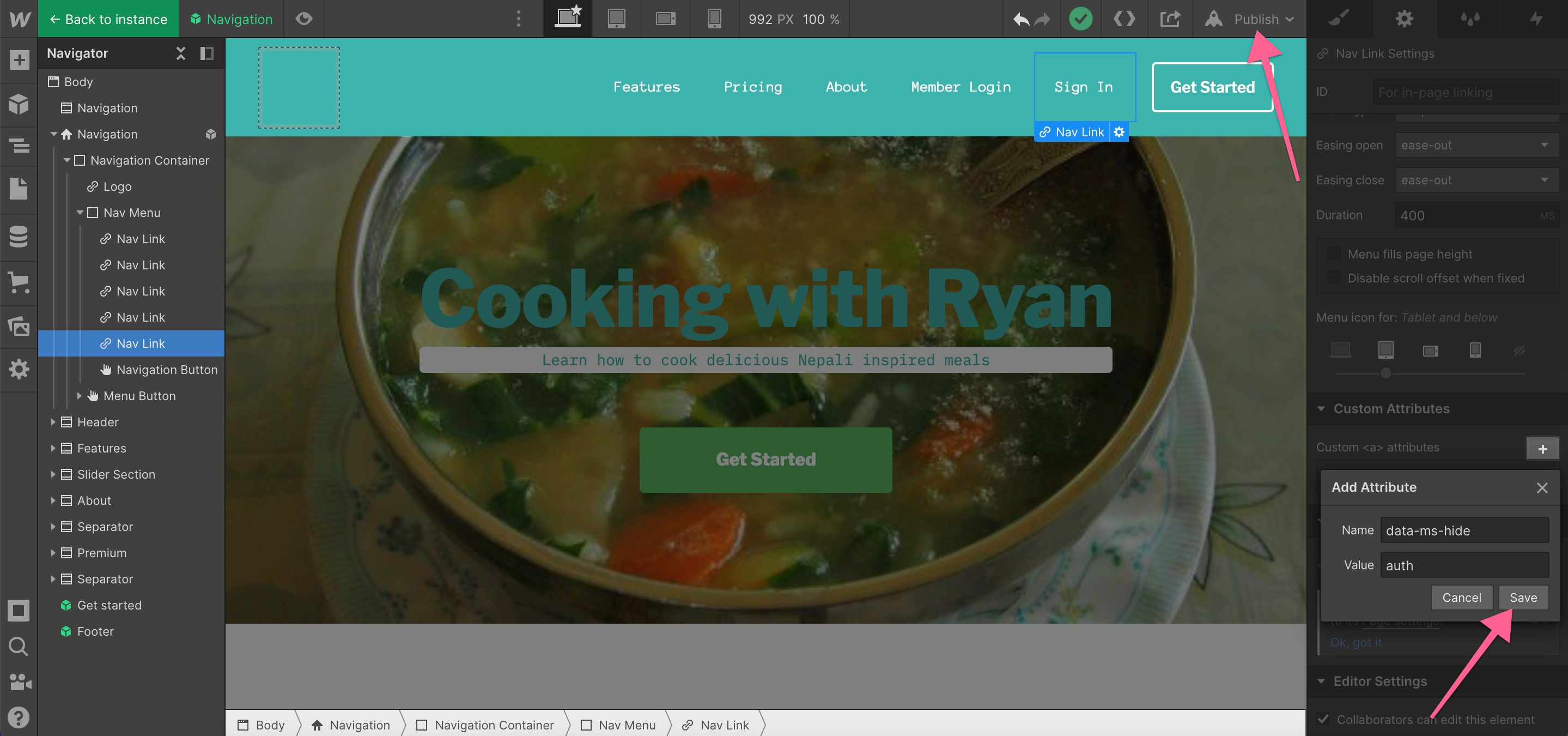 You can add data attributes to any element on your Webflow website by following the below steps. In this example, we'll edit existing elements in the top navigation.