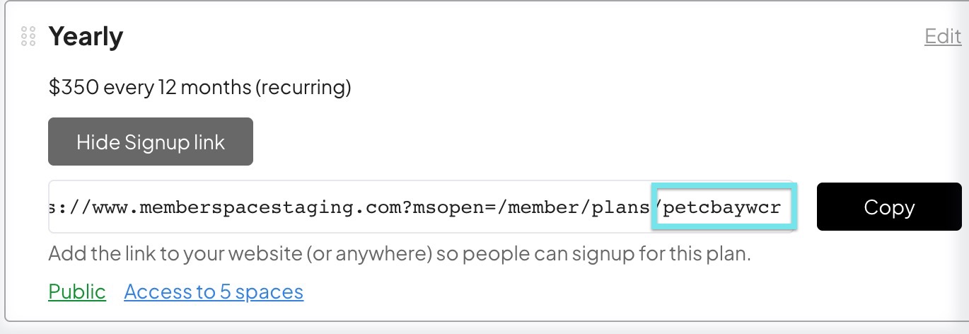 Next, go back to the All-Plans Link Embed tag (where you previously pasted it in Step 3) and swap out "all" at the end of the embed tag with the Member Plan ID. It should resemble this: