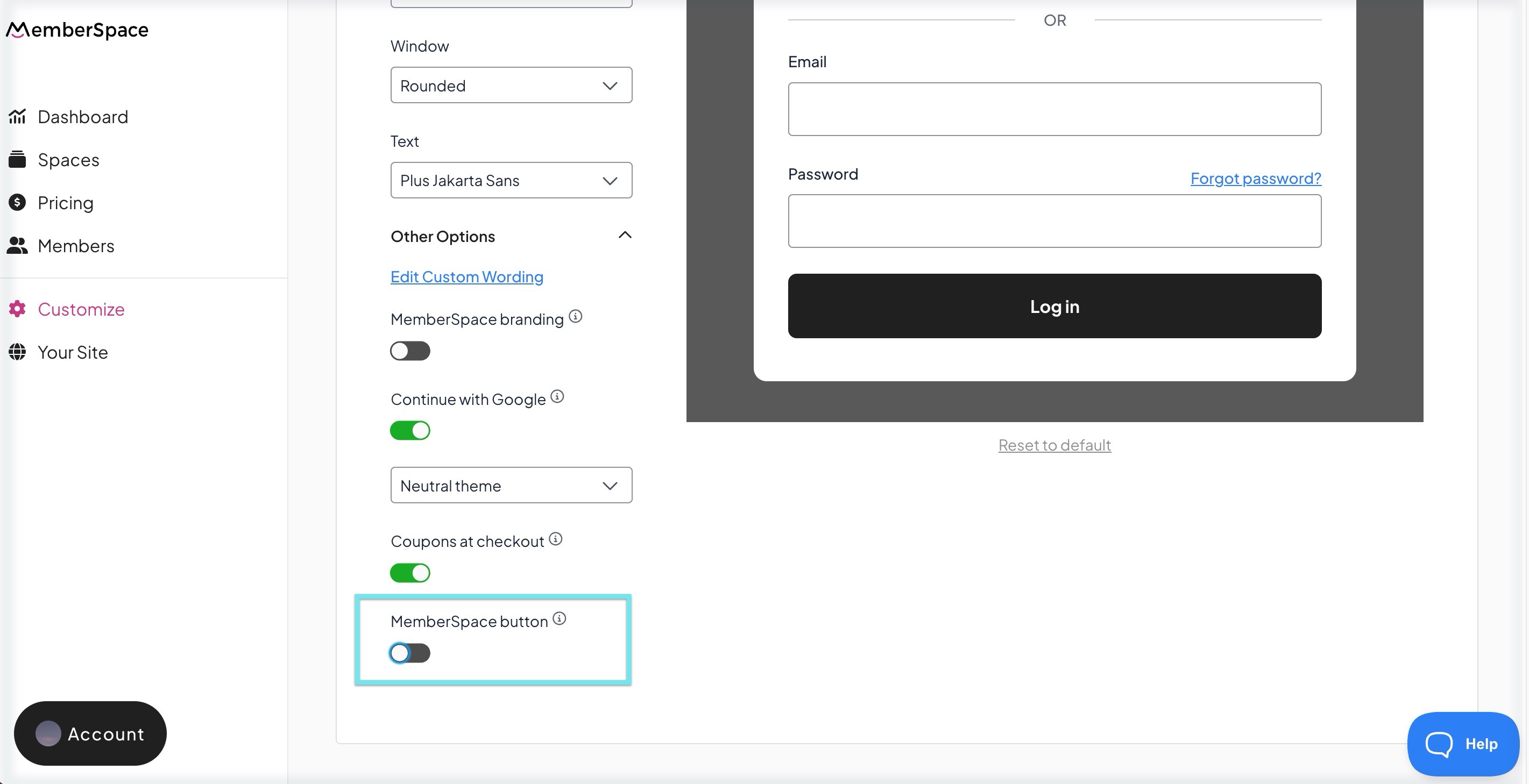 - In your MemberSpace account, go to Customize > Look & Feel > Other Options > MemberSpace button.